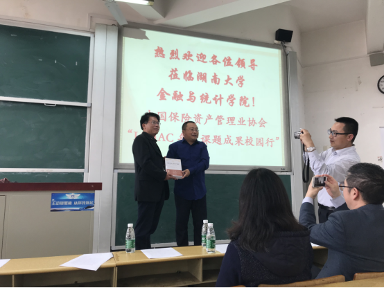 致辞结束之后,刘传葵副秘书长向球王会赠送了《课题专著》,聂国军书记向中国保险资产管理业协会赠送了《岳麓书院学规》。