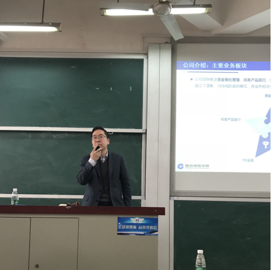 主题演讲结束后,建信资管副总经理梁建刚先生对区块链和保险资管的问题表达了自身的看法和观点。他指出区块链是一个颠覆性的产品,值得学界和业界进行深入的探讨和研究。随后,梁总对银行、证券和保险资管的业务、盈利模式和社会功能进行了简要的总结。接下来,梁总针对同学提出的关于“保险资管另类投资在配置过程中的策略”这一问题进行了解答。他概括出目前保险资金主要投资的五大类另类产品,分别是:基础设施债权计划、不动产债权计划、股权计划、项目资产支持计划和资金的直接投资。并分别进行了举例说明。
