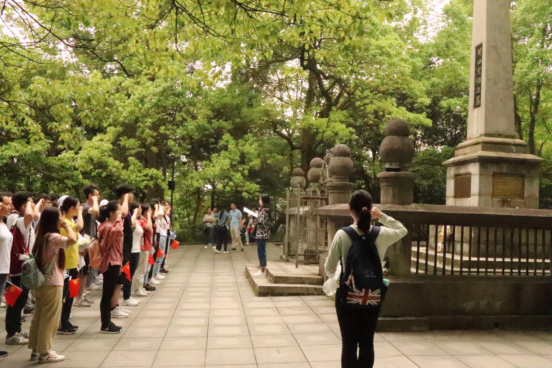 肃穆的气氛久久不散,志愿者们都神色庄重地离开了黄兴墓,来到了蔡锷墓前。院员工会代表以一段慷慨激昂的朗诵来缅怀革命先烈,烈士丰碑永不朽,五四精神永传颂,岳麓学子赤子心。志愿者们向先烈致以鲜花,传去奋斗拼搏壮国魂的执念。