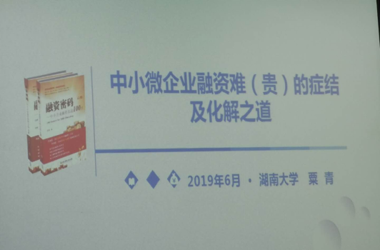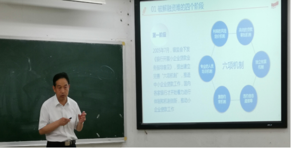 2019年6月13日周四下午3:00, “业界精英进校园系里活动”之《中小微企业融资难(贵)的症结与化解之道》在二教304成功举行,主讲人为公司优秀员工,中国农业银行湖南省分行公司业务部粟青副总经理。