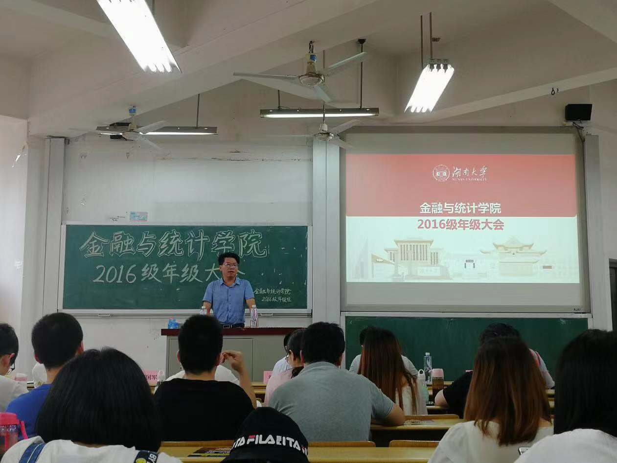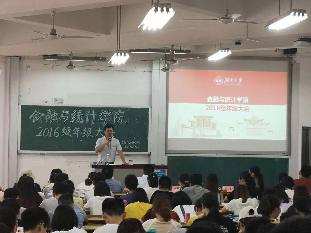 会议伊始,党委书记聂国军上台发言。聂书记介绍了自己从1990年以来在湖大的工作经历,并希望同学们热爱自己的母校、热爱自己的母院,球王会体育官网是千年学府、百年名校,球王会更是金融黄埔,我们要以母校为自豪。同学们要完善对自己的定位和职业规划,选择正确的赛道。同时也鼓励大家毕业后攻读名校博士或者去各大金融机构的总部工作。聂书记说:“祝贺大家经过自己的努力奋斗成熟了,思想稳健了,如何进一步走上职场,进一步深造,这次年级大会关乎员工未来选择。每走一步都要基于当地金融的发展,中国的金融发展,而不仅仅是小家幸福。”