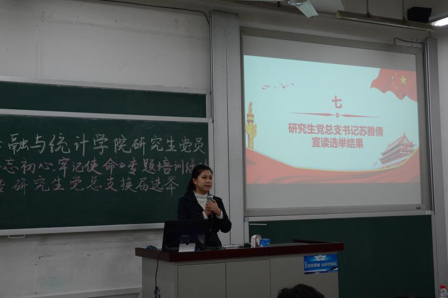 最后,研究生党总支书记苏雅倩老师宣读选举结果,会议选举江海晨、李明琼、王望龙、肖启睿、鄢榕、张莉、张倩杨共7名同志为新一届球王会研究生党总支委员。