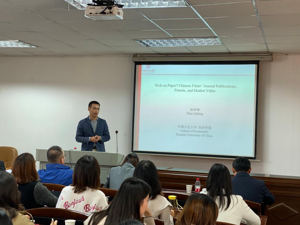 论坛进入第二阶段,由李海奇副经理主持。中国人民大学赵奇锋博士主讲《Rich on paper?Chinese firms' journal publications, patents, and market value》,该文章从当前企业发表论文的视角切入,说明企业应多增加学术研究方面的投入。论文点评人厦门大学宁博博士表示文章有用又有趣,同时提出了论文的几点可待商榷之处,与赵奇峰博士进行了深入的交流。