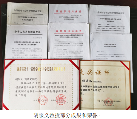 在繁重的教学之余,胡宗义老师不忘做好学术科研。科研道路上,他始终保持着认真务实的态度。从教30余年里,主持了教育部哲学社会科学研究重大课题攻关项目、国家社会科学基金重点项目、国家自然科学基金面上项目、国家社科基金一般项目等一系列国家级项目,出版各类著作和教材11 部,发表了200余篇核心期刊论文,突出的科研能力使他多次获得省部级大奖,在学术界也享有较高声誉,曾被评为“中国哲学社会科学经济与管理科学交叉学科排行榜最有影响力学者”。胡宗义老师对自己要求很高,一篇论文从想法到正式发表,总是精雕细琢,力求完美,能因一句话如何准备表述而思索几天。