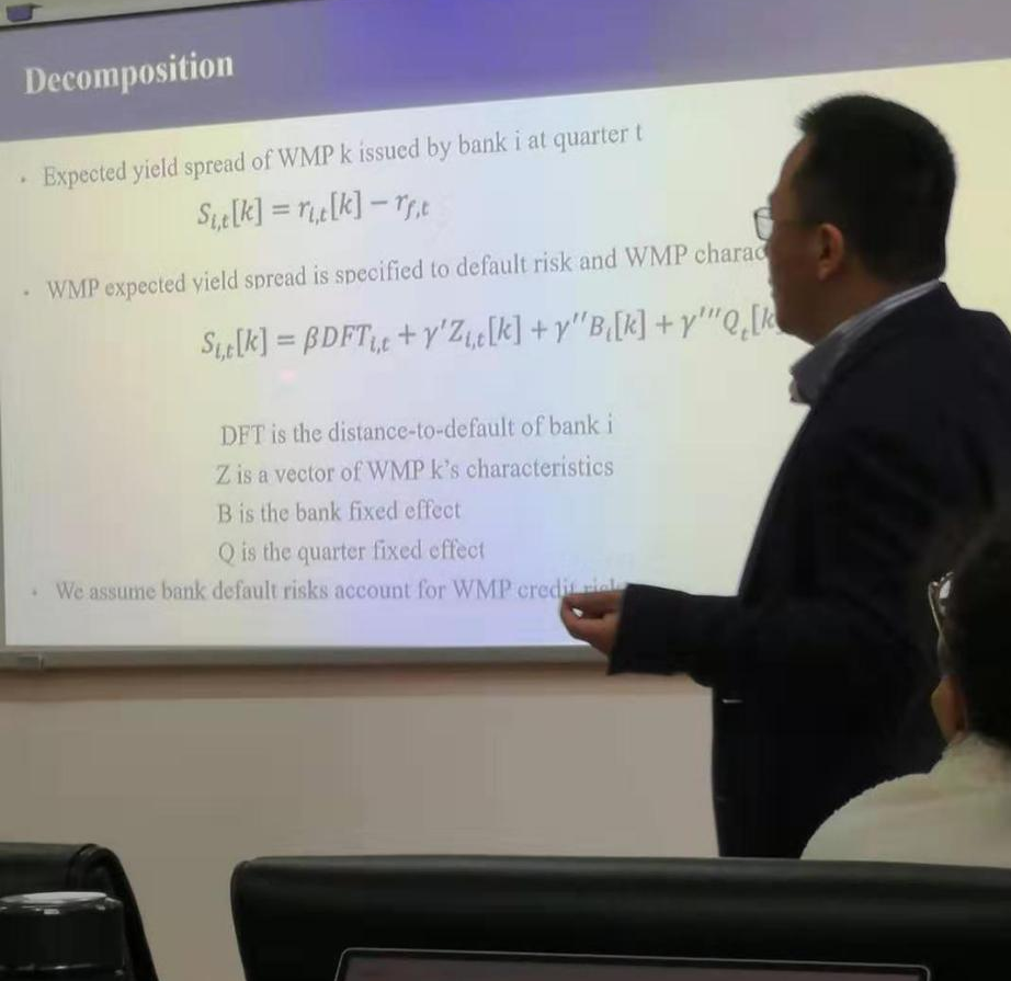 2019年11月15日上午10点,由球王会主办的第237期金融与统计论坛在红楼210会议室进行。本次论坛邀请到了爱尔兰国立大学都柏林公司的肖亚军助理教授展示论文《影子资金和经济增长,来自中国理财产品市场的证据》。论坛由李海奇副经理主持,公司多位对于银行体系的系统风险、资产定价等领域感兴趣的老师和同学参加论坛。