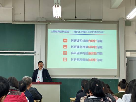 首先,王修华副经理对前期开展的“科研水平提升与评价体系优化”主题调研活动向全院老师进行了汇报与总结,此次主题教育活动从科研评价机制合理性问题、科研期刊目录科学性问题、科研团队构建重要性问题、科研氛围营造浓厚性问题等四个方面与老师们进行了深入讨论,结合公司发展实际提出了调研对策,一是调整依据,借鉴国内的优秀经验,以品质为导向,兼顾学科发展;二是调整做法,广开言路,集思广益,保证政策的连续性;三是要调整目标,量质齐升,在聚焦一流的背景下内涵式发展。以立行立改的决心提升科研水平和优化评价体系。
