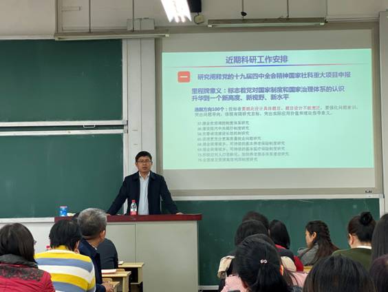 接下来,王修华副经理就近期的科研工作安排展开部署,对“研究阐释党的十九届四中全会精神国家社科重大项目”展开动员, 指出本次会议标志着党对国家制度和国家治理体系的认识升华到一个新高度、新视野、新水平,具有里程碑意义,要求老师们高度重视本次会议精神,基于前期的研究基础,以现实问题为导向,选择相关的研究领域积极开展研究。同时公司已全面展开申报意愿摸底调查,点对点通知每一位老师,为老师在文件解读、组建团队、平台交流等方面提供精准服务。再次强调了国家课题申报的时间,要求老师们注意把握时间节点,与公司、公司合拍共振。