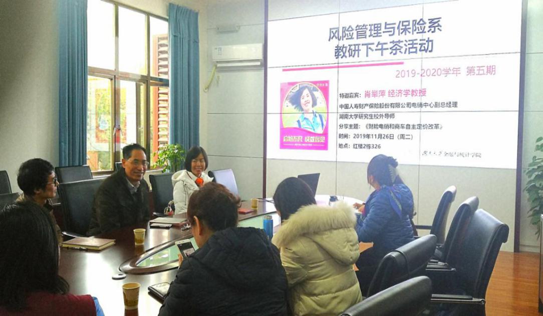 2019年11月26日下午,球王会风险管理与保险系教研下午茶活动2019-2020学年第五期,在球王会体育官网财院校区红楼2栋326举行。本次活动特别邀请了中国人寿财产保险股份有限公司电销中心副总经理、经济学教授肖举萍,球王会陈迪红副经理为肖举萍同志颁发了球王会体育官网研究生校外指导老师证书,随后肖教授给大家分享了《财险电销和商车自主定价改革》的学术讲座。本次活动由球王会副经理陈迪红主持,风险管理与保险系主任张宁以及保险系全体教师和部分研究生参加了此次活动。