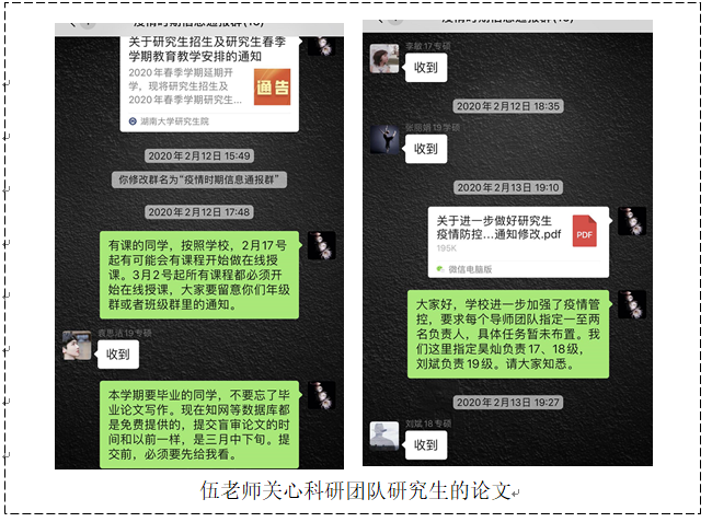 不仅如此,疫情防控期间,伍老师对于研究生的论文指导也十分上心,不愧是先后四次获得“球王会体育官网毕业设计(论文)优秀指导老师”称号的优秀教师。目前,伍老师正在指导15位研究生,其中不乏即将毕业的数名研究生。疫情防控期间,伍老师多次运用邮件、微信指导各位研究生的论文,孜孜不倦地教育着祖国未来的建设者。