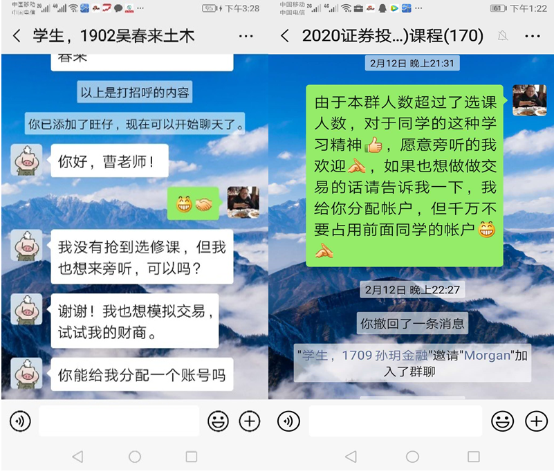 曹老师本期教学任务繁重,担任了三门课程的教学工作,全校授课员工约350人。一场突如其来的灾难,打乱了他所做的教学准备。为了适应线上教学,本科78级、年近花甲的曹老师认真学习各个在线教学平台、各种技术的使用。经过半个多月的不懈努力,他掌握了在线教学方法,将每一位同学都纳入到相应的课程群,同时还吸引了一些没有选上课的同学入群旁听。对于《证券投资分析》课程,为了让员工充分利用好目前在家的时间,曹老师还提前一周为同学们建立了证券交易账户,让同学们在理论学习的同时又接触到现实的市场,受到了同学们的热烈欢迎。