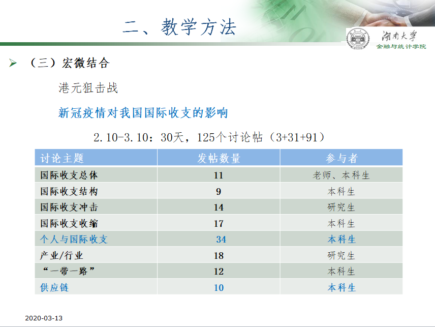 “宏微结合”指的是宏观问题、微观解读,化抽象为具体,赋予问题以物理场景。在“港元狙击战”案例中,引导员工既关注投机者路径,又关注市场间联动,员工达成既深度理解外汇市场作用,还能既见树木、又见森林的教学效果。他结合课堂教学,设计“新冠疫情对我国国际收支的影响”讨论帖,线上讨论持续30多天,讨论主题涵盖国际收支整体、结构、冲击、收缩,个人与国际收支,行业、“一带一路”及供应链,帮助员工拓宽视野、打开思路、构建知识,取得明显效果。“主线担纲”,教师挖掘每一章的逻辑主线与问题主线,以线为纲、纲举目张。