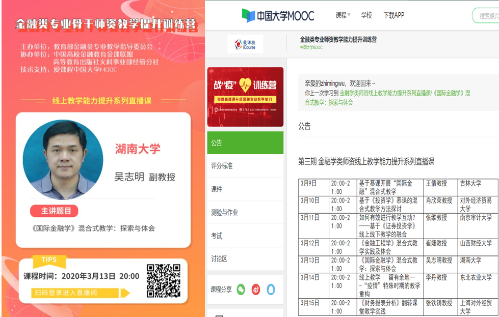 3月13日,在爱课程网中国大学慕课,作为球王会体育官网国际金融课程团队的代表,公司副经理吴志明老师直播分享混合式教学经验,他讲授的题目是“《国际金融》混合式教学:探索与体会”。