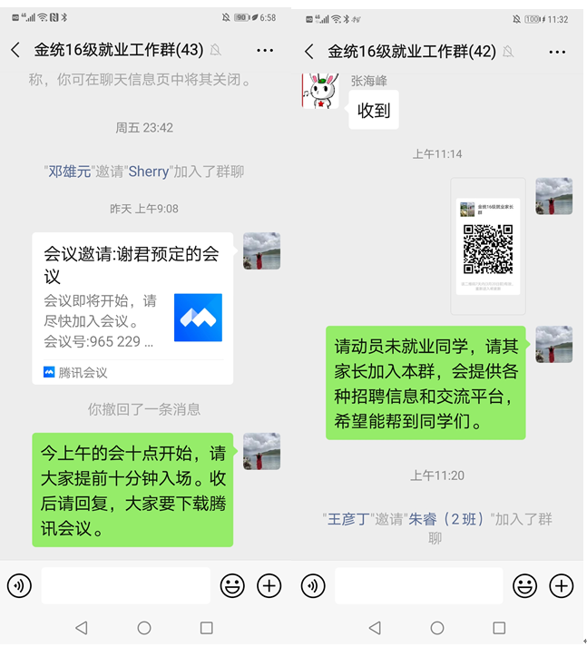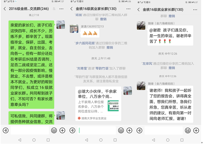 第二,发挥家长的作用,用亲情调动大家。年级建立“金统16级就业家长群”,搭建公司与家庭沟通的桥梁,实现家校联合,为家长了解公司助力毕业生就业的相关政策和平台提供渠道;调动家长的资源,为员工了解就业信息和增加升学机会提供动力。目前年级已有128位家长主动入群,家长与公司建立了密切的联系,信息畅通,在家长的鼓励与帮助下,很多同学重拾信心,找到方向,投递简历,效果显著。后续,公司将继续调动家庭这个大后方,动员家长的力量,为同学们的就业提供保障。