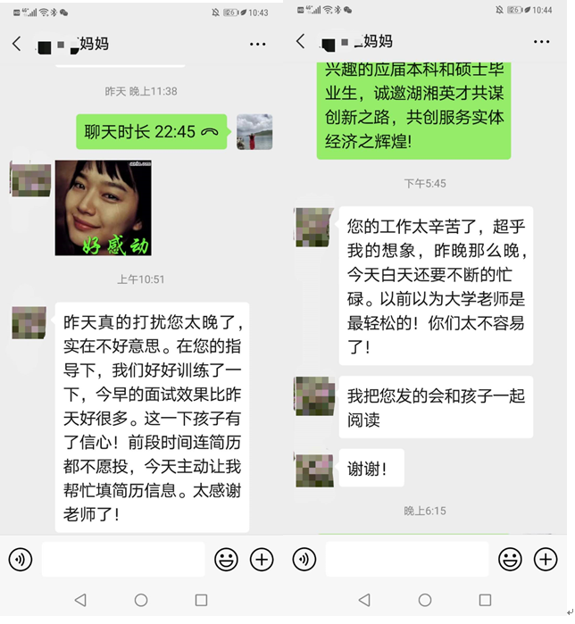 第四,发挥辅导员的作用,用真情推动大家。毕业年级辅导员在与待就业同学密切沟通的同时,保持和家长的交流,通过家长了解员工动态以及存在的疑惑、困难等,而后一对一进行就业指导,精准助力,帮助同学们寻找到适合的、热爱的工作岗位。