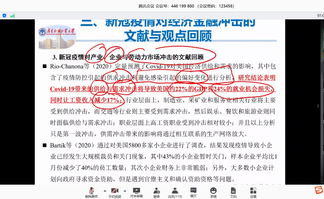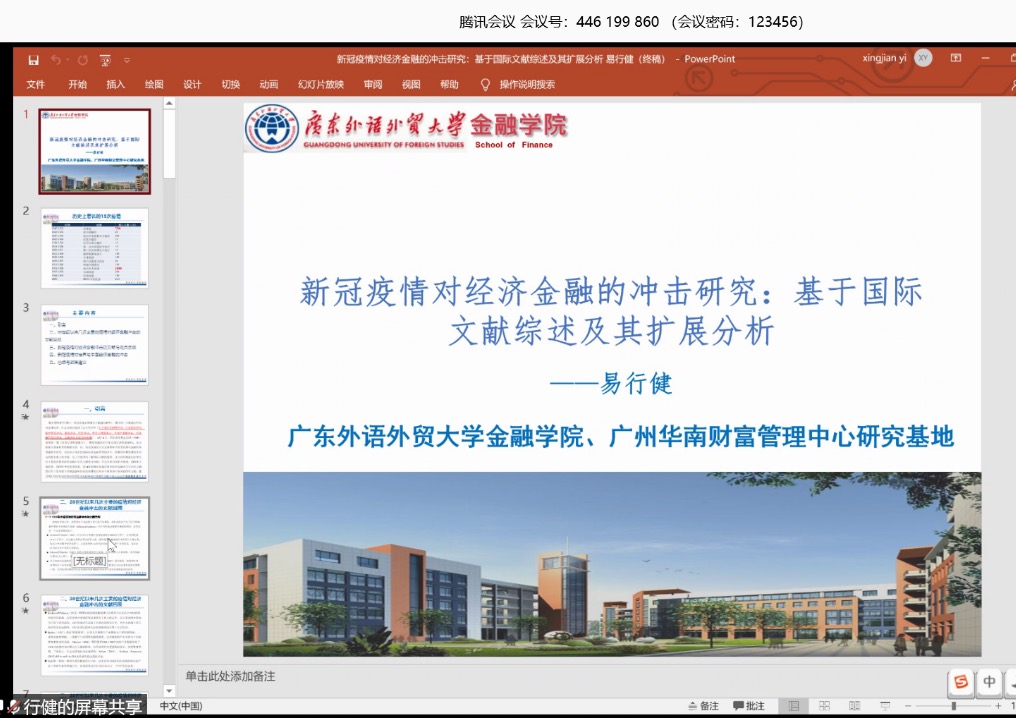 为在疫情期间更好打造“云上学术”氛围,2020年5月20日第252期金融与统计论坛在腾讯会议线上举行,本次论坛的主题是:新冠疫情对经济金融的冲击研究:基于国际文献综述及其扩展政策分析,主讲人是广东外语外贸大学金融公司经理易行健教授。此次论坛由球王会经理潘敏教授主持,球王会教师及博士生等119人踊跃参与此次论坛。