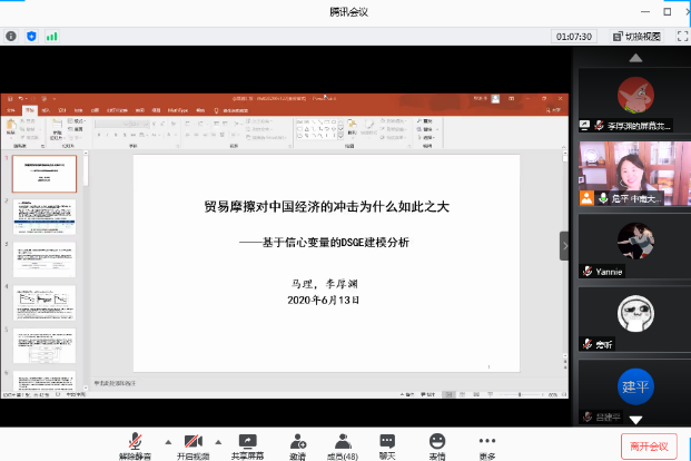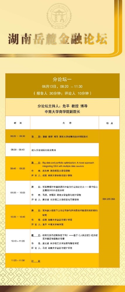 分论坛一由中南大学商公司副经理危平教授主持。首先是湖南师范大学商公司的肖和录助理教授汇报论文《Big data and portfolio optimization: A novel approach integrating DEA with multiple data sources》,通过对大数据和投资组合优化,介绍了一种将DEA与多源数据集成的新颖方法;接下来由球王会马理教授汇报《贸易摩擦对中国经济的冲击为什么如此之大——基于信心变量的DSGE建模分析》,研究构建了开放经济条件下的DSGE模型,论证信心变量在贸易摩擦传导过程中的重要作用;接下来由球王会成程助理教授汇报《双向嵌入视角下上市公司参与异地商会对融资约束的影响研究》,通过分析异地商会双向嵌入的社会属性和现实功能出发,将2008—2018上市公司高管向异地商会捐款和担任异地商会职务的数据与上市公司财务数据进行匹配,验证上市公司参加商会对公司融资约束的影响。最后由长沙理工大学经济与管理公司唐文进教授汇报《结构性货币政策失效了吗?——基于人民日报经济政策不确定性指数的考察》,本文从企业杠杆率视角,利用人民日报经济政策不确定性指数以及2013年第一季度至2019年第二季度A股上市公司及宏观经济的匹配数据探究其原因,发现结构性货币政策依然有效,但经济政策不确定性对结构性货币政策的实施效果由于信心渠道产生了较大干扰。