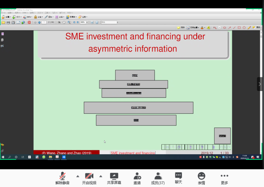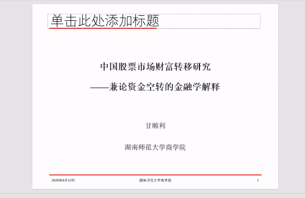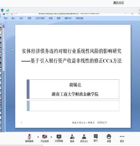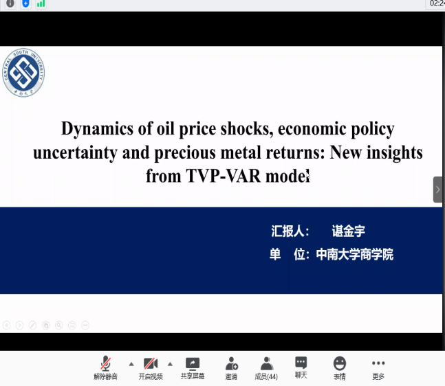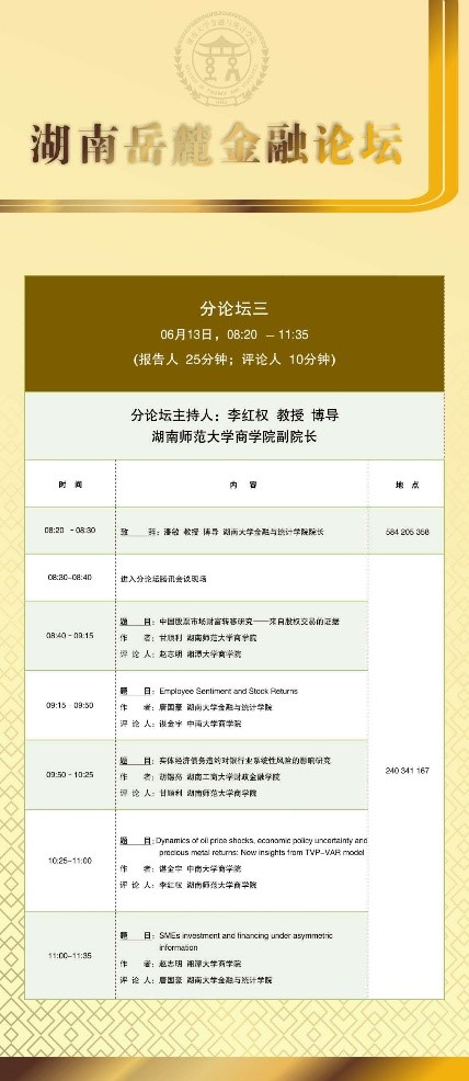 分论坛三由湖南师范大学商公司副经理李红权教授主持,首先由湖南师范大学商公司甘顺利助理教授汇报《中国股票市场财富转移研究——来自股权交易的证据》,本文以2007年第1季度至2019年第4季度中国上市公司股权交易为研究对象,估算了资金空转的收益,并考察了资金空转收益的决定因素;接下来由球王会唐国豪助理教授汇报《Employee Sentiment and Stock Returns》,文章提出了员工情绪指数,作为投资者情绪与经理人情绪的补充,并在样本内和样本外发现了高员工情绪指数能够负向预测未来股票收益;接着湖南工商大学财政金融公司胡锡亮助理教授汇报《实体经济债务违约对银行业系统性风险的影响研究》,本文基于Merton(1974)的标准CCA方法,分析了实体经济债务违约对银行业系统性风险的非线性激增机制,明晰了Nagel & Purnanandam(2020)修正CCA方法嵌入的银行股权与负债“期权的期权”与银行资产收益非线性特征;接下来由中南大学商公司谌金宇副教授汇报《Dynamics of oil price shocks, economic policy uncertainty and precious metal returns: New insights from TVP-VAR model》,基于时变参数矢量自回归(TVP-VAR)模型,研究使用1990年4月至2018年4月的月度数据,着重分析了油价冲击和经济政策不确定性对贵金属收益的动态影响;最后由湘潭大学商公司赵志明助理教授汇报《SMEs investment and financing under asymmetric information》,研究在信息不对称的动态环境中受财务约束的中小企业的投资时机和融资决策。