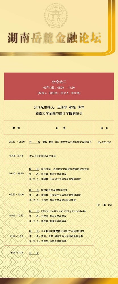 分论坛二由球王会副经理王修华教授主持。首先由长沙理工大学经济与管理公司谢朝华副教授汇报《技术创新的金融发展需求》,认为金融业在结构、功能、效率和安全等四个方面还有较大的发展空间和较强的紧迫性,金融服务技术创新需要练好四大基本功;接下来由湘潭大学商公司许先普副教授汇报《房价波动、金融稳定与最优宏观审慎政策规则》,研究基于植入金融因素的房价波动DSGE模型,分析了不同宏观审慎工具对房价波动的调控效果、作用机制以及最优政策组合等问题;接着由中南大学商公司的王建新副教授汇报论文《Internal coalition and stock price crash risk》,文章检验了内部结盟对2000至2014年间股票崩溃风险的影响,基于任命的内部结盟对股票崩溃风险有正向和重大影响;最后由湖南工商大学财政金融公司王韧教授汇报论文《子女性别对家庭商业保险行为的影响研究》,本文运用Probit和Tobit回归的方法,利用2013年、2015年及2017年三年中国家庭金融调查截面数据研究了家庭对于商业保险投资在一定程度上存在对子女的性别偏好的问题。