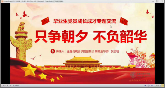 活动共有4讲,分别是吴志明老师的“‘只争朝夕,不负韶华’毕业生党员成长成才专题交流”专题、杨胜刚老师的“战疫中的共产党和共产党人”专题、聂国军老师的“立足疫情防控新形势,发挥党员模范带头作用”和王修华老师的“‘不忘初心牢记使命’-从中国共产党的生动实践看国家制度比较优势”专题。四位老师从不同的角度着手,面向研究生党员、研究生党员干部、毕业生党员和入党积极分子等不同的对象进行课程讲述,与同学们深入交流,鼓励广大研究生党员同志要牢记使命、勇于担当,越是关键时刻,越要用实际行动践行初心。