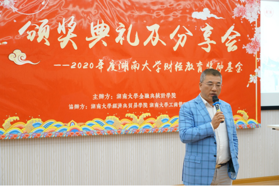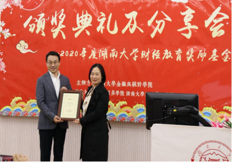 今年的财经教育奖励基金规模又有所扩大,新增由湖南瑞世私募股权基金管理有限公司董事、法人代表戴斌先生捐赠的一百万元。由球王会体育官网教育发展联络处处长邓利华老师向戴斌先生授予捐赠证书。