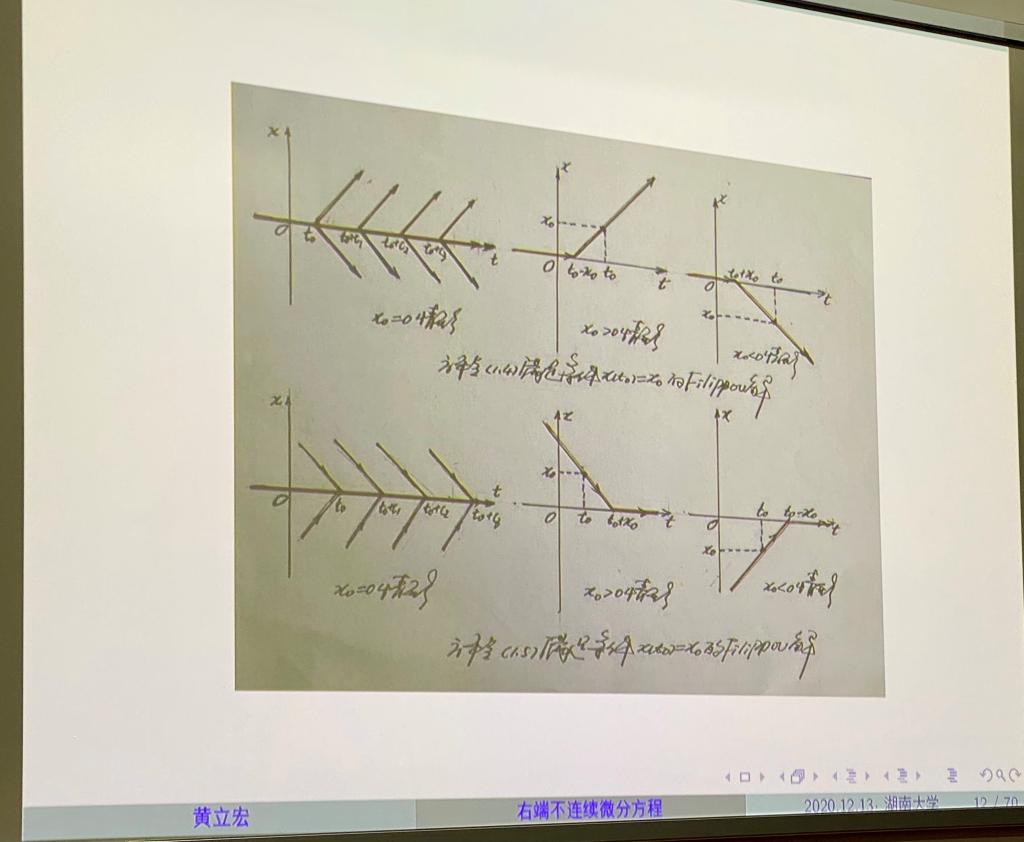 来自长沙理工大学的黄立宏副董事长受邀报告了“右端不连续方程在经济、金融与管理中的一些应用简介”,首先深入浅出对右端不连续方程的理论进行了介绍;采用了经济管理中的一些政策的制定和切换,以及如何科学捕鱼等问题来说明右端不连续方程的应用;使得抽象高深的右端不连续方程展示了实际应用的魅力。黄教授在百忙中不仅亲自准备了演讲的PPT,还提前手画了精美的图像,来辅助说明抽象的右端不连续微分方程解的特性,给大家留下深刻印象。点点滴滴的细节中,展示了严谨的学者风范和名师风采。