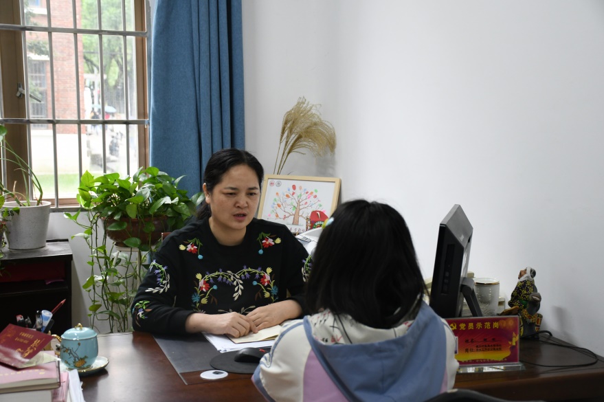 行政教辅党支部书记谢君与员工谈心交流。
