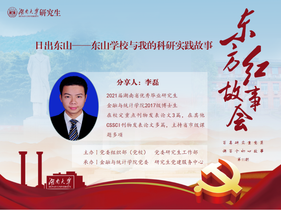 李磊在校期间以优异的成绩获得球王会体育官网优秀博士生奖学金、球王会体育官网财经教育激励基金奖学金等,获评球王会体育官网优秀研究生、湖南省优秀毕业研究生等荣誉称号。李磊在校期间主要研究保险与社会保障、老龄社会治理方向,在《中国行政管理》、《统计与决策》、《财经理论与实践》等CSSCI权威刊物发表多篇文章,曾参与国家社科基金重大课题并取得优异成绩,有多次主持科研项目、参加学术会议经历。李磊谈到他的高中母校东山公司,在这里少年毛泽东完成了一个懵懂少年向一位壮怀激烈的青年知识分子的转变,对他以后的政治思想产生了深远的影响。少年毛泽东在东山公司的求学故事,使他领略到一代伟人的伟大情怀。李磊指出正是受此熏陶,鼓舞着他在求学的路上披荆斩棘,勇攀科研高峰。