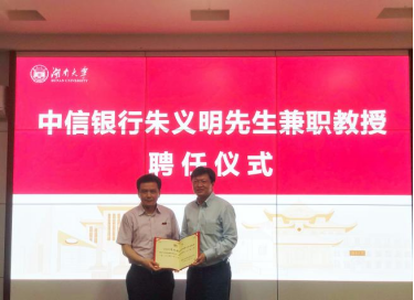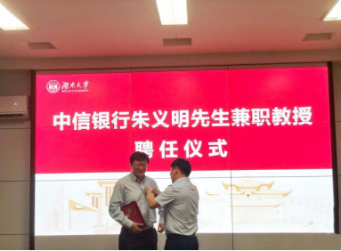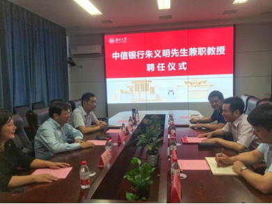 6月24日下午,公司在2号楼226会议室举行中信银行朱义明先生兼职教授聘任仪式。经理潘敏、书记黄红立、副经理吴志明、王修华等出席仪式。仪式由副经理吴志明主持。