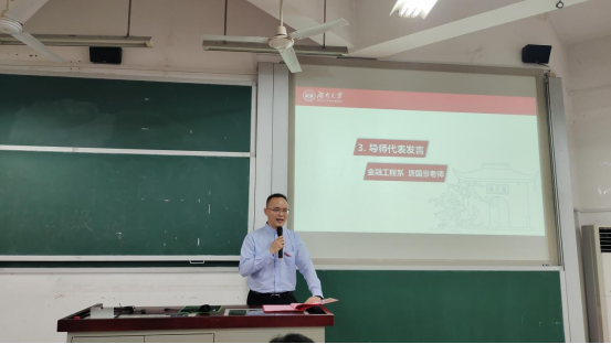 导师代表金融工程系唐国豪老师发言,希望同学们葆有谦卑之心、勤勉之心、好奇之心,不断拓宽自己的知识边界。