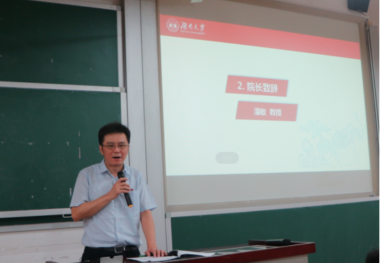 在奏唱国歌之后,潘敏致词。潘敏首先对新同学的到来表示衷心祝贺与热烈欢迎,并围绕青年的“志气、骨气、底气”对同学们提出了三点建议:一是砥砺奋进,厚植志气,努力成为拉动国家发展和社会进步的一架“马车”;二是勤勉致知,强硬骨气,积累扎实的知识储备、培养过硬的综合素养验;三是鉴往知来,涵养底气,从千年学府的文脉和“金融黄埔”的传承中汲取前行力量。