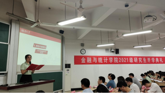 紧接着,硕士新生朱芷萱同学代表2021级研究生发言,她号召新生们秉持“实事求是,敢为人先”的校训,为湖大建设“富有历史文化传承的中国特色世界一流大学”贡献力量,在拼搏和奋进中书写青春华章。