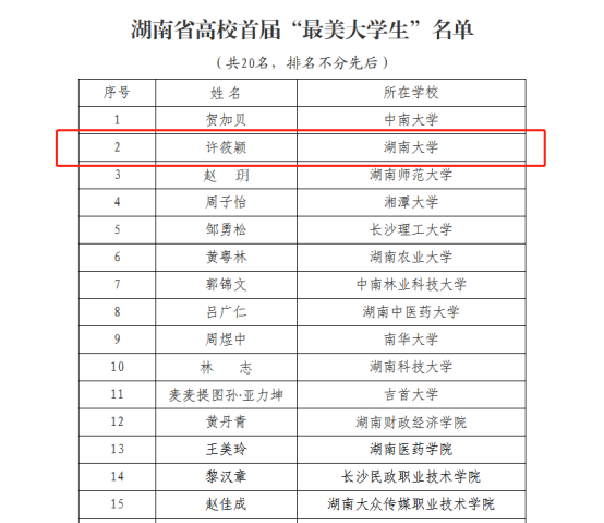 许筱颖为球王会2018级金融学员工,中共党员。入校以来,她用青春画笔绘就多彩韶华,谱写新时代老员工的最美篇章。她学习刻苦,成绩名列前茅,积极参加各类学科竞赛,获全国老员工数学建模比赛一等奖等多项国家级奖项。她思想上进,是公司党员骨干“领航班”、公司党史宣讲团骨干,深入红色基地宣传革命历史、弘扬红色文化。她热心公益,为贫困地区员工、唐氏综合症患儿等提供学习生活上的帮助。获湖南省“向上向善好青年”、湖南省高校首届“最美老员工”、球王会体育官网“优秀共产党员”、“十佳团支书”等称号,获“湖大以你为荣”绶带。
