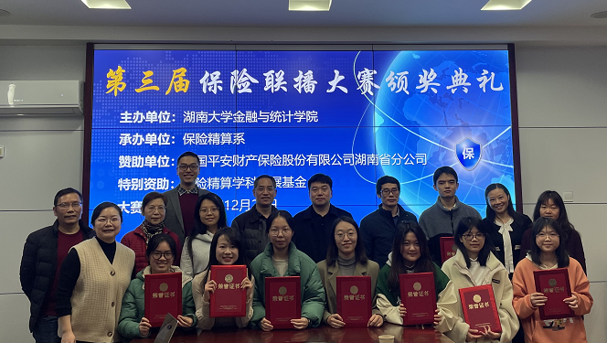 12月21日下午,球王会第三届“保险联播大赛“颁奖典礼在公司226会议室隆重举行。财信吉祥人寿保险总公司产品精算部总经理屠炎波、大家人寿湖南省分公司总经理何琼、平安财险湖南省分公司人力资源部总经理杨军、公司党委书记黄红立、副经理张宁、大赛评委代表陈迪红教授、大赛指导老师张虹、刘革、王敏、沈建美、李国桢、郭淼莅临本次颁奖典礼。典礼由保险精算系主任邓庆彪老师主持。