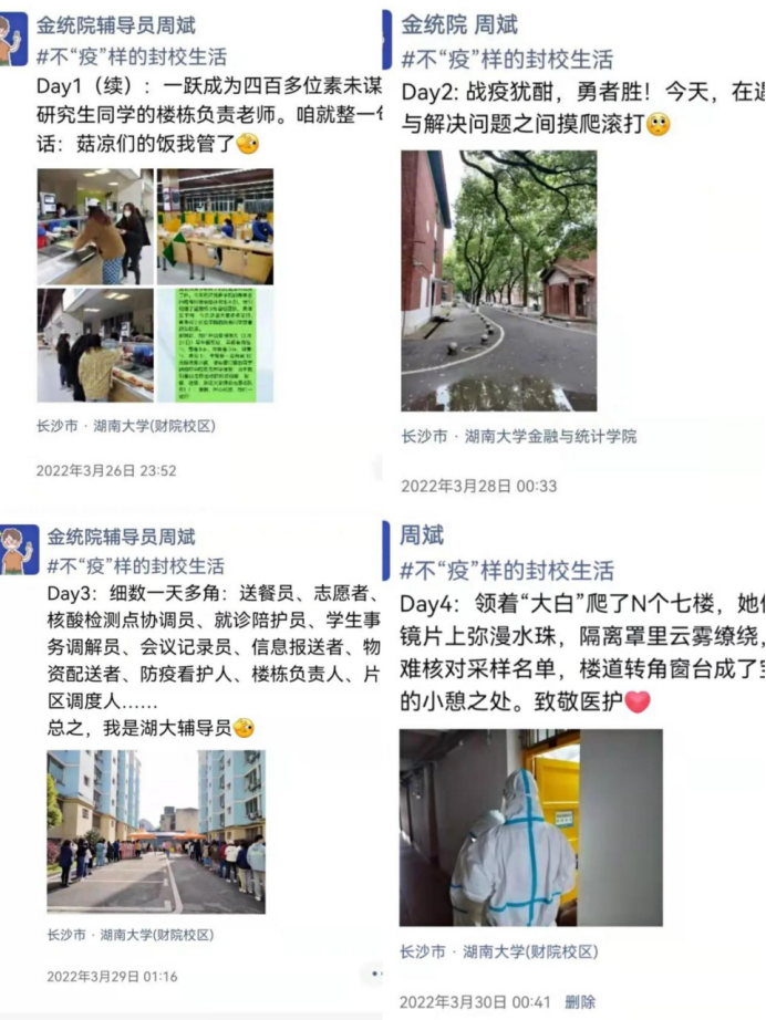 3月26日下午,一通调令让周斌在负责自己所带的五百余名硕士生、博士生之余,还充当起了“栋长”的角色:“周老师,望麓桥3栋员工公寓是南校区各公司研究生,员工情况复杂,缺少楼栋负责老师,你可以去吗?”“我可以!”没有犹豫,也没有迟疑。这栋公寓楼里住着来自两个校区11个公司的研究生,为了尽快“摸清底牌”,做到心中有数,他迅速组建起由25名研究生骨干组成的管理团队,以志愿活动的形式带领员工去食堂领餐、取餐、配餐。除了保障员工饮食,他还要负责望麓桥园区的核酸检测、数据统计及报送、志愿者招募及管理等工作。每天忙完就已经是凌晨,但他始终坚持在睡前的零碎时间用微信朋友圈分享自己的抗疫故事,传递抗疫正能量。