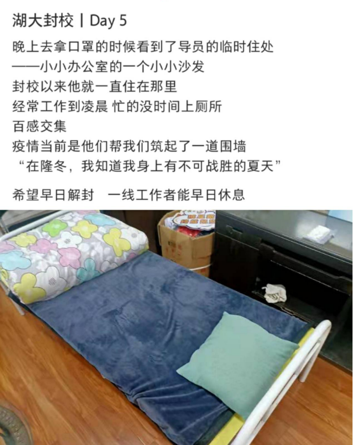 杨晨在这场“疫情遭遇战”里多了一个“亲密战友”——放在办公室里的行军床。疫情发生后,他住进了办公室,不管有任何紧急任务,他总是第一个到。白天,他在志愿者、就诊陪护员、核酸检测点协调员、楼栋负责人、物资配送员、事物调解员等各种角色中不断切换,夜晚,他回到办公室,开始一对一联系员工,关心员工的近况,为员工修改简历、传授面试经验等等。疫情打乱了很多计划,但是他深知毕业班员工升学和就业的进度不应该中止。他说:“每天都挺累的,但是也要坚持,而且,我还有我的‘战友’陪着我呢。”