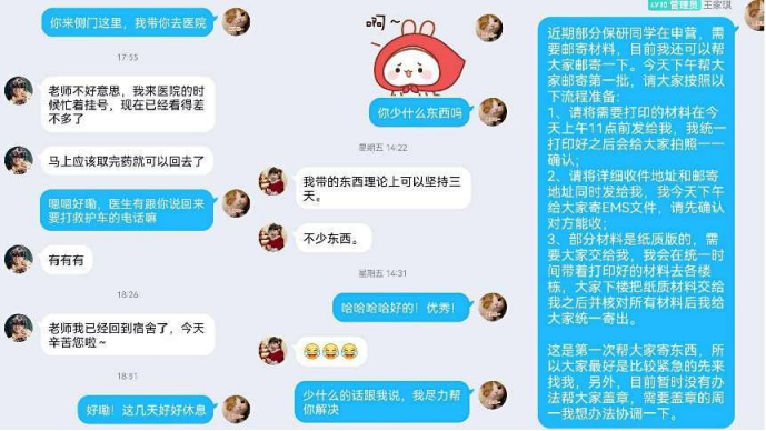 去年刚留校的王家琪接到“就地静止”通知后,“立刻行动”,赶到楼栋和值班员一同维持秩序,劝返有意向外出的同学。除了要摸清自己带的四百余名员工的去向,安抚员工情绪外,她还要负责员工公寓A栋的“包干”工作。A栋一共有三百多间寝室,为了做到“精准摸排”,她一间一间寝室走访,并叮嘱大家务必完成每日的“全员核酸”。她说:“弟弟妹妹们的事情,一件都不能耽搁。”员工生病了,她第一时间陪同前往校医院看病,时刻关注员工的状态;大三的员工申请保研夏令营需要很多材料,她亲力亲为,为员工开具证明、打印成绩单、寄送快递……她和员工们说得最多的一句话就是:“有任何问题,随时与我联系。”