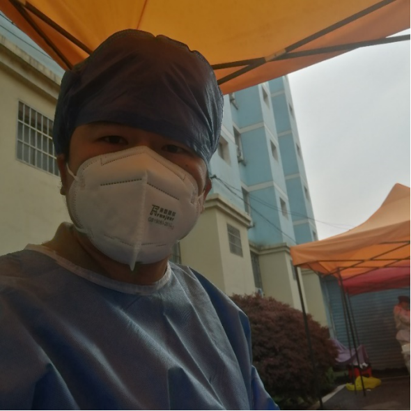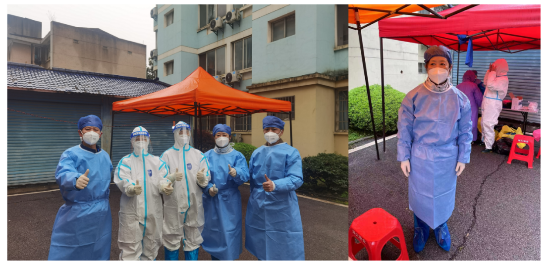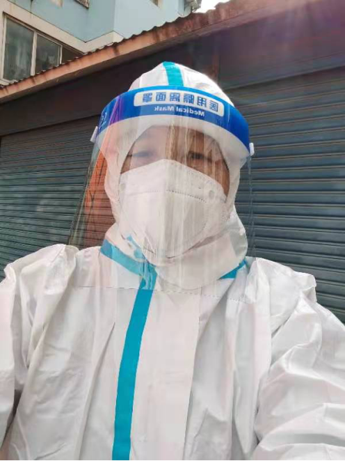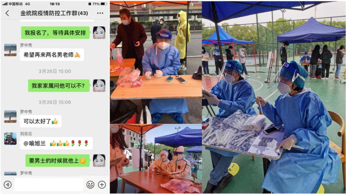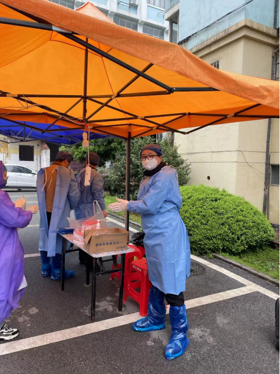 张琳教授不仅是一名教师,也是一名人大代表、政协委员,平时课程多,任务重。当得知公司需要志愿者支持抗疫工作时,她第一时间报名参加。当天,张老师被分配到龙王港园区协助做核酸检测,这是个细致的工作。她穿着防护服,进行核酸检测前的各种准备,并且两人一组负责健康码录入和分发棉签,督促员工们扫二维码,提醒员工们保持间距等。