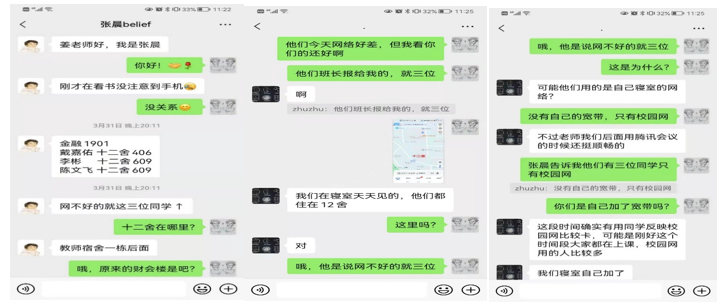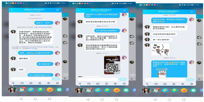 刘晓兰老师在线授课当天查看员工上课详情时,发现一位同学反复加入腾讯会议达14次,马上在QQ群里加该同学好友,了解到是因为该同学的寝室网络状况不佳,让她们寝室的同学都填写了校园网、在线教学问题反馈表,同时也向院教务办的李晖老师反映情况,问题得到了及时解决。员工感受到老师真挚的关心和帮助,相信之后的课程学习必然不会再“掉线”。