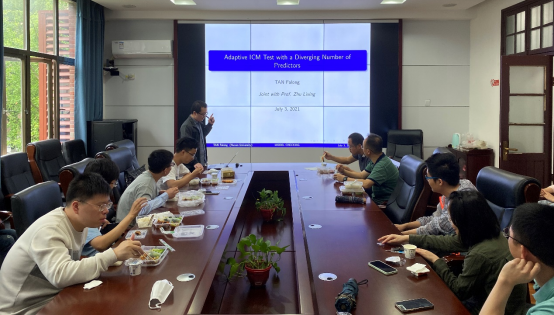 第一场报告由谭发龙老师进行主题为《Adaptive ICM Test with a Diverging Number of Predictors》的论文分享。谭发龙老师谈到这是一篇偏计量经济学的文章,主要用于模型进行检验,名字叫做积分条件均值检验(ICM test)。谭老师指出,在局部平滑测试中,优势是容易设置检验的临界值,但是这里使用非参数估计的方法会存在维数灾难的问题;在全局平滑测试中,由于维数超过3维就会导致维数灾难问题,所以这里避免使用非参数估计的方法,但是所收敛的分布是不能确定的,因此也不好确定临界值。在这里,本文使用wild bootstrap来确定临界值,但是在高维的情况下,检验会失效,所以模型需要先进行降维之后再进行检验。除此之外,本文中还得出了一系列的理论成果,谭老师在现场的师生们进行了热烈且深入讨论。