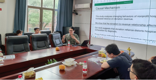 研讨会上,郭淼老师展示的论文主题为《Nonprofit Behavior Altered by Monetary Donations: Evidence from the U.S. Hospice Industry》。郭淼老师从盈利性机构和非营利性机构的运营模式出发,结合产业经济学的理论,从供需两个角度阐明了两类机构的运营决策机制,并指出学界对非营利性机构的研究有待完善。郭淼老师着重关注临终关怀行业,研究捐赠收入占比与病人寿命之间的关系,发现对于非盈利机构而言,捐赠收入占营业收入的比例每提高一个百分点,病人的存活时间提高百分之八;最后,郭淼老师从内推、广告宣传等隐形病人选择方式对该实证结果进行了经济解释。