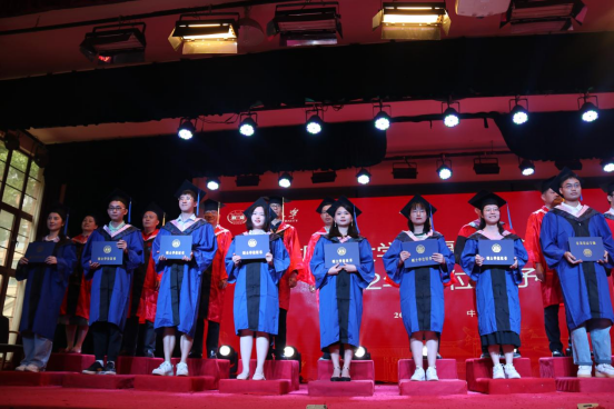 院学位评定分委员会成员、教师代表为毕业生颁发学位证书并拨正流苏,毕业生依次上台领取学位证书,留下珍贵的合影。随后,毕业生代表向老师们献花,感谢师恩。