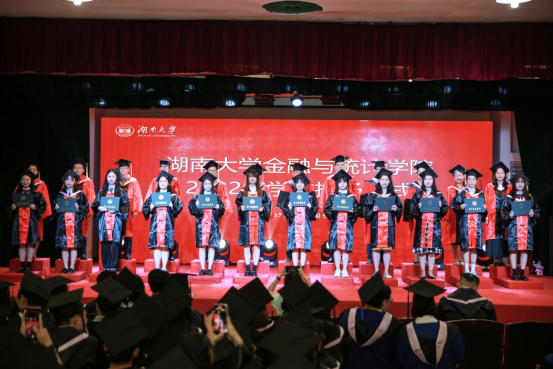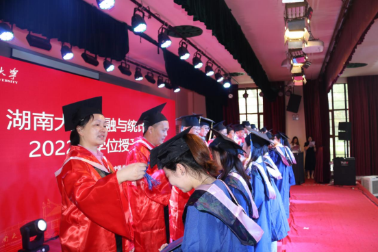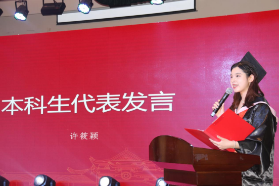 毕业生代表、2018级博士研究生徐照宜讲述了在湖大十年求学的成长故事和人生感悟,他表示是湖大让自己勇敢地尝试无限可能,湖大不仅仅只是研究学问的学术殿堂,更是“实事求是”的精神图腾;财院校区也不只是享受青春的大公司园,更是“经世致用”的文化象征。他祝福每位毕业生将自身发展同国家富强、民族复兴紧密结合,愿二十年后能用更响亮的声音向母校汇报,交出金统人无愧于国家和时代的答卷。