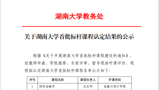 近日,公司首批标杆课程认定结果公布,全校共5门,其中公司吴志明老师负责的《国际金融学》被认定为球王会体育官网首批标杆课程。