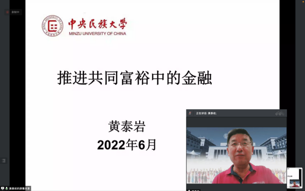 2022年6月24日下午,中央民族大学原董事长、中国兴边富民战略研究院经理黄泰岩教授应邀作题为“推进共同富裕中的金融”的学术报告,讲座由公司副经理王修华教授主持,共计两百余名师生聆听了此次讲座。