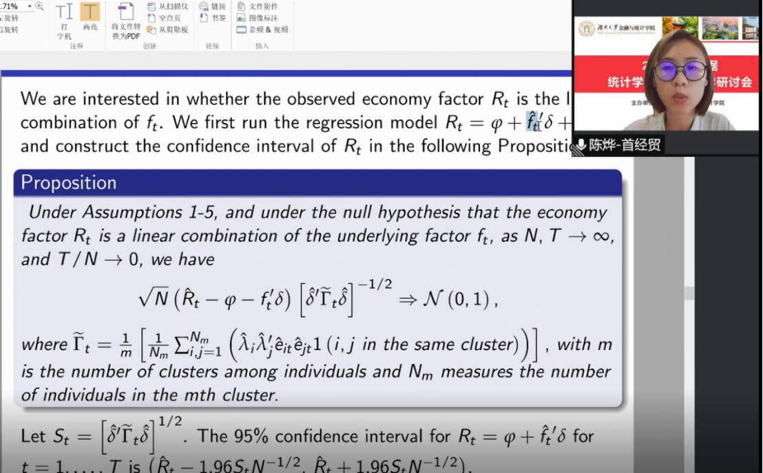 陈烨副教授报告的题目是“Mixed Dynamic Factor Modeling applied to Explosive House Prices”。陈烨副教授从全球各地的房价上升现象出发,从计量经济学的角度,对房价上升的原因进行了分析和总结。她指出,一方面,随着经济的发展,人们对美好生活的不断追求,在城市中买房带来了需求量的上升;另一方面,买房需求会随着各种政策的变化而变化,尤其是利率的变化。接下来,她构建了关于房价的混合动态因子模型,其中包含三类因子:驱动房价迅速上升的因子、服从单位根过程的因子、平稳过程的因子。她利用信息准则与主成分分析分别估计出因子个数与因子载荷。在给定一系列假设后,得出了因子的渐近结果。陈烨老师将这个方法应用到我国与澳洲的房价数据分析中,从数据分析的角度分别得出了引起房价迅速上升的原因。这个方法对分析房价迅速上升的原因分析做出了贡献。