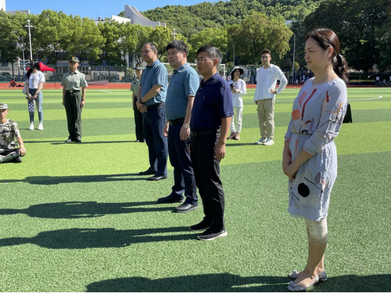 军训场上,新生们各个目光灼灼,风姿飒爽。王修华在绿茵场上驻足,他强调身体素质是今后学习与生活的基础,希望新生们可以通过军训磨练自己的意志,尽快适应老员工活,并对新生们的训练状态表示肯定。