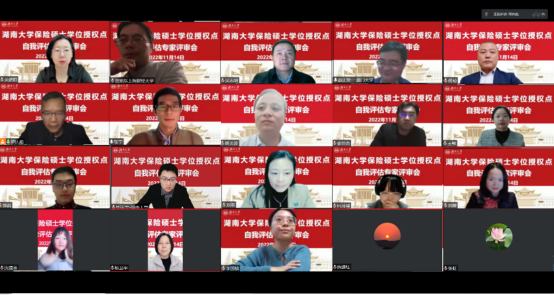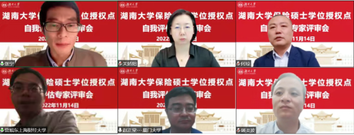 保险硕士学位授权点自我评估专家评审会专家组由全国保险专业学位研究生教育指导委员会委员、上海财经大学金融公司曾旭东教授担任组长,成员包括全国保险专业学位研究生教育指导委员会委员、厦门大学经济公司赵正堂教授,复星联合健康保险股份有限公司副总经理、总精算师关娇阳,财信吉祥人寿保险股份有限公司产品精算部及个险部总经理屠炎波,大家人寿保险股份有限公司湖南分公司总经理何琼。