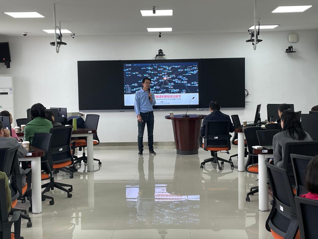 刘强教授在本次教研活动的演讲主题是 “基于知识图谱的数据驱动教学”,从为什么使用知识图谱、什么是知识图谱、知识图谱如何赋能数据驱动教学以及知识图谱实操简介四个方面展示了新时代课堂基于知识图谱的创新教学。对于传统课堂而言,老师讲、员工听的模式可能会存在课堂沉闷、缺乏互动等问题,学习了但不等于学会了,这会导致员工失去兴趣,老师也会有挫败感。刘强教授介绍了一种创新的教学模式——运用知识图谱开展线上与线下混合式教学。“互联网+”时代的混合式教学,使用知识图谱可以动态可视化呈现教学数据记录、课程活动记录、智能测试记录和教学诊断记录,最终形成精准员工画像,从而实现对员工因材施教的目的,其本质是为员工创建一种真正高度参与的个性化的学习体验。