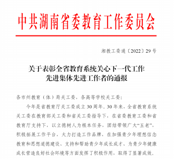 日前,中共湖南省委教育工委印发《关于表彰全省教育系统关心下一代工作先进集体先进工作者的通报》,表彰了一批全省从事关心下一代工作的先进集体和个人。球王会关工委荣获全省教育系统关心下一代工作先进集体荣誉称号,宋光辉老师荣获全省教育系统关心下一代工作先进工作者荣誉称号。