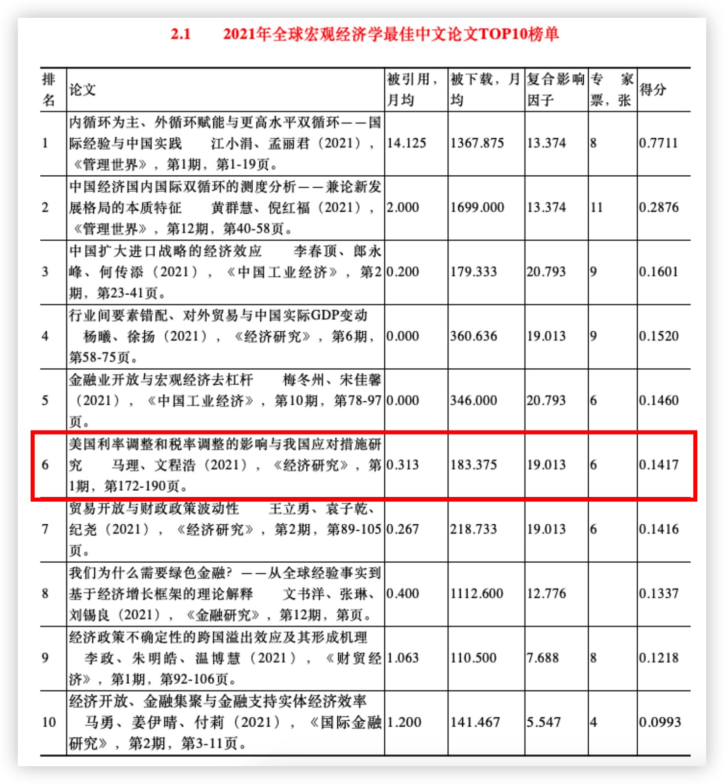 近日,《世界经济年鉴》编辑部组织评选的2021年世界经济学“最佳论文TOP10”榜单揭晓,公司马理教授与其指导博士生文程浩在《经济研究》合作撰写的论文《美国利率调整和税率调整的影响与我国应对措施研究》,入选“全球宏观经济学2021年最佳中文论文TOP10”榜单。